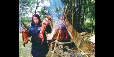 袁啟蓮在展示熏制的臘兔 周超文何智敏文/圖 “真劃算,這肉兔經(jīng)過鹽漬、晾干、熏烤制成臘兔后,因其色澤美觀、肉嫩味鮮、食不塞牙,每只臘兔要多賣20元。這